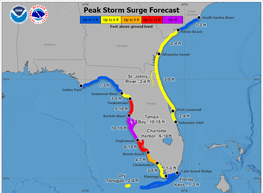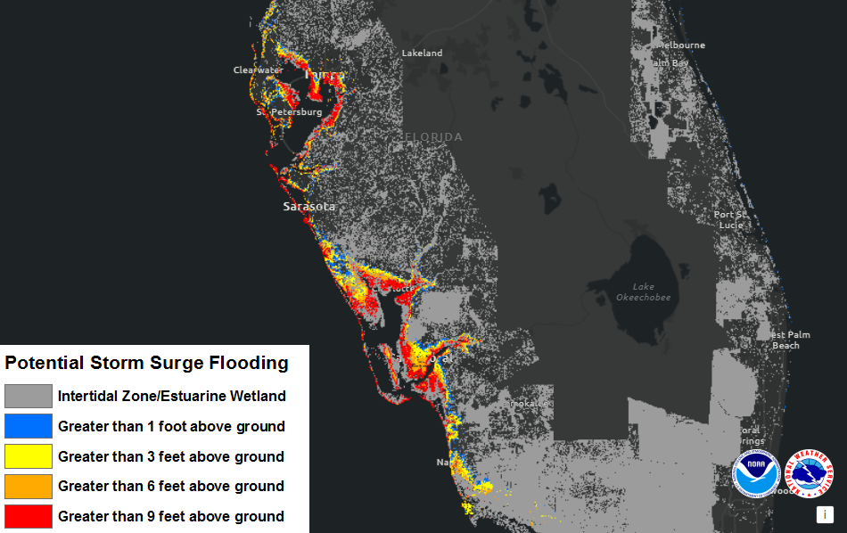 The map above shows the forecasted flooding levels from storm surges, helping residents gauge how each area, including major cities like Tampa, St. Petersburg, and Fort Myers, is likely to be impacted.